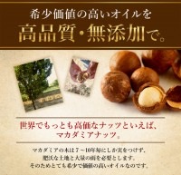 マカダミアの木は数年に1回しか実をつけない為、そこから取れる純度100%のマカダミアナッツオイルはとても貴重でとても高い栄養分を含んでいます。マカダミ屋の天然由来100%無添加のマカダミアナッツオイルは加齢と共に減少するパルミトレイン酸を20%以上含み、肌の内部へと浸透する性質が高く、ヴィークル効果と言われる一緒に使う化粧品の浸透を助ける効果があり、その浸透性の高さ(※角質層まで)から、「ヴァニシングオイル(消えるオイル)」とも称されています。パルミトレイン酸は食用油にはほとんど入っていない貴重な脂肪酸ですので、肌への刺激がとても少なく、酸化しやすいリノール酸の含有率がとても低いため、酸化しにくく長期間の保存が可能です。伸びがよく、非常に高い保湿効果を持ちながらビタミンEを含んでおりますので、ボディートリートメントだけでなく、フェイスケアや、ヘアケアなど気になる部分への集中ケアにも大変効果的です。オレイン酸が主体のオイルで、石けんのメインのオイルに向いていますので、手作り石鹸の材料に使って頂けますよ。●マカダミ屋マカダミアナッツオイルの特徴1.天然由来成分100%2.徹底的な精製により高純度のクオリティーを実現3.植物由来成分100%なので、オイル焼の心配もありません。●どのように抽出していますか?当店のマカダミアナッツオイルは低温圧搾(コールドプレス)製法により抽出することによりマカダミアナッツ含まれている本来の栄養成分を余すことなく取り入れる効果があります。●パルミトレイン酸の特徴とは?パルミトレイン酸の働きでうるおいを与える。そのため、このパルミトレイン酸が不足するとうるおい不足になりやすくなります。マカダアナッツオイルにはそのパルミトレイン酸がなんと、20%以上含まれているのでいつまでも若々しくいたい方にとてもおすすめです。