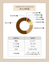 ■マカダミアナッツオイル100%■充填 : 日本(Made in Japan)■産地 : ケニア■主成分 : マカダミアナッツ■抽出方法 : 低温圧搾法(コールドプレス)■性質 : 無色〜淡黄色な液体でほとんど匂いはない。 ■こちらは天然由来100%植物性のオイルとなります為、製造ロットにより、多少色目に差(無色〜淡黄色)がございますが、ロット毎に品質に問題が無いことを確認し販売しておりますのでご安心してご使用ください。 ■オレイン酸:54.6%■パルミトレイン酸 : 22%■パルチミン酸 : 8%■ステアリン酸 : 3%■アラキジン酸 : 2.5%■リノール酸 : 2.7%■比重:約0.91 (例:1000ml = 約910g)■未開封の場合3年。開封後は冷暗所に保管の元、半年〜1年を目安にご使用ください。■自然発火の原因となりますので、染み込んだタオルや衣類を放熱の悪い状況に放置したり、高温(乾燥機使用不可)、長時間日光にさらさないでください。※2016年8月現在の公開数値です。