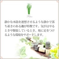 ベチバーは何世紀も前からインドでは使われていました。根は日除けとして吊り下げられ、外の熱気を冷まし、家の中では甘い香りが漂っていました。 香りは、土を思わせる重い香りがし、香水のベースとしても用いられています。 個性的な強い香りのため、初心者には敬遠されがちですが、共に深みのある心地よい香りがします。 静かな木陰を連想させるような静かで落ち着きのある趣が特徴です。「安静の油」とも呼ばれ、ベチバーの独特の落ち着いた香りは、ベースノートとして調香の際に他の芳香とよくなじむことから、香水の原料としても広く利用されています。 精神的には、気がはやるときや緊張しているとき、地に足をつけるような環境をサポートします。 ブレンドのベースノートしての活用がおすすめです。 香りに深みが増し、少量でも香りが長続きするものになります。 強い香りで他の香り打ち消しますので、少量でご使用ください。精油の色は濃く、香りも強いので衣服につかないよう注意してください。