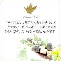 スパイスとして馴染みのあるシナモンリーフですが、精油はスパイスよりも香りが強いです。 オイゲノールが含まれているため、コットンなどに含ませて、クローゼットや押入れなどカビが発生しやすい場所に入れておくと効果が期待できます。 スパイシーで深い香りは、アロマランプでお部屋に香らせたり、 梅雨時のじめじめした空気をさわやかにしてくれるルームフレグランスとしても人気です。