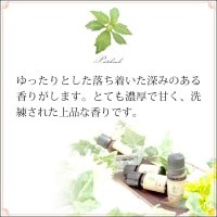 パチュリは、コクを湛えた深みのある香りが魅力です。 甘く濃厚な香りで人気の高いイランイランと並んで、愛される香りとして有名です。 緊張で張り詰めた心や心配事などで不安定になっている気持ちを優しく落ち着かせてくれる香りで、 前向きな気分を取り戻す手助けをしてくれます。 仕事や勉強に追われて忙しい時にはマグカップにお湯を8分目まで注ぎ入れ精油を2〜4滴落とし、 デスクやテ−ブルに置いて香りを楽しむと気持ちが楽になるでしょう。 また、キャリアオイルに対して精油を1%以下混ぜればセマサージ用のオイルが簡単に作れます。 疲れたからだをマッサージでほぐしてあげる事で、より質の良い睡眠へと導きます。