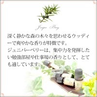 ジュニパーベリーは、ヒノキ科の植物でサイプレスと同様、檜風呂の香りに少し似たウッディーで爽やかな香りが特徴です。 森の木々を思わす香りが、優しく緊張をほぐして心的活力を蘇らせ、リフレッシュさせてくれます。 集中力を発揮したい勉強部屋や仕事場の香りとして、とても適しています。 リフレッシュできる環境をサポートします。