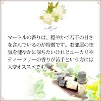 ■マートル■マートルの香りは、クールなユーカリやティーツリーとは異なり、穏やかで若干の甘さを含んでいるのが特徴です。お部屋の空気を健やかに保ちたいけれどユーカリやティーツリーの香りが苦手という方には大変オススメのエッセンシャルオイル(精油)です。