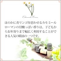 ■カモミール・ローマン ■青リンゴを思わせるローマンカモミールの甘酸っぱい香りは、マイルドで、鎮静作用にすぐれています。子どもからお年寄りまで幅広く利用することができることから、ラベンダーとともにもっとも人気のある精油の一つとなっています。その香りは、不安や緊張、怒り、恐怖の感情をほぐして、心を深く落ち着かせてくれる優しい力があります。子供の寝つきが悪いときや、かんしゃくを起こしているときにもおススメです。