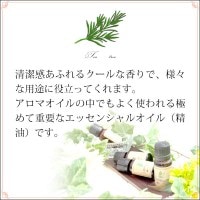 【精油の取扱い注意事項】 ◆原液のまま肌につけないでください。 ◆飲んだり、目や粘膜に触れないようにして下さい。 ◆3歳以下の乳幼児には使用しないで下さい。 ◆妊婦の方は、精油を使用する前に医師にご相談下さい。 ◆柑橘系の精油をキャリアオイル等に混ぜ使用の際は、日光にあたるとしみ等の原因となる事があります。肌への使用後6時間以上は日光にあたるのを避けて下さい。 ◆小さなお子様の手やペットの届かない冷暗所に保管し、未開封の場合は1年、開封後は半年〜1年以内にご使用ください。 ◆肌につけて利用する際はパッチテストを行ってください。 ◆酸化を防ぐため、保存は遮光瓶がお勧めです。 ◆使用する道具や容器は消毒し、手もきれいにしておきましょう。◆蓋はしっかり閉めて保管ください。◆ドロッパー/中栓は液漏れや、抜け落ちる原因となりますので、最後までしっかり押し込んでご使用ください。 ◆長期にわたって同じ精油を使い続けることは避けて下さい。 ◆精油によっては、神経系を刺激しすぎることがあります。使用量に注意してください。 ◆火気には十分ご注意してご使用ください。 ◆オイルのついた物を乾燥機に入れないでください。◆アロマオイルは医薬品、医薬部外品、化粧品ではありません。手作りコスメの基材や香を楽しむ目的としてお使いください。